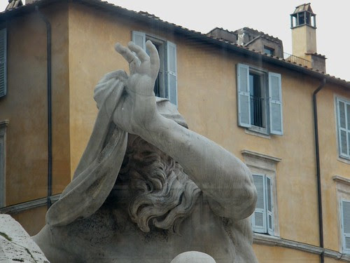 La personificazione del Nilo ha il capo velato perchè all'epoca della progettazione della fontana le sorgenti di questo fiume non erano ancora state scoperte (la fontana è del 1651 mentre la definitiva scoperta delle sorgenti del Nilo risale addirittura al 1934)
